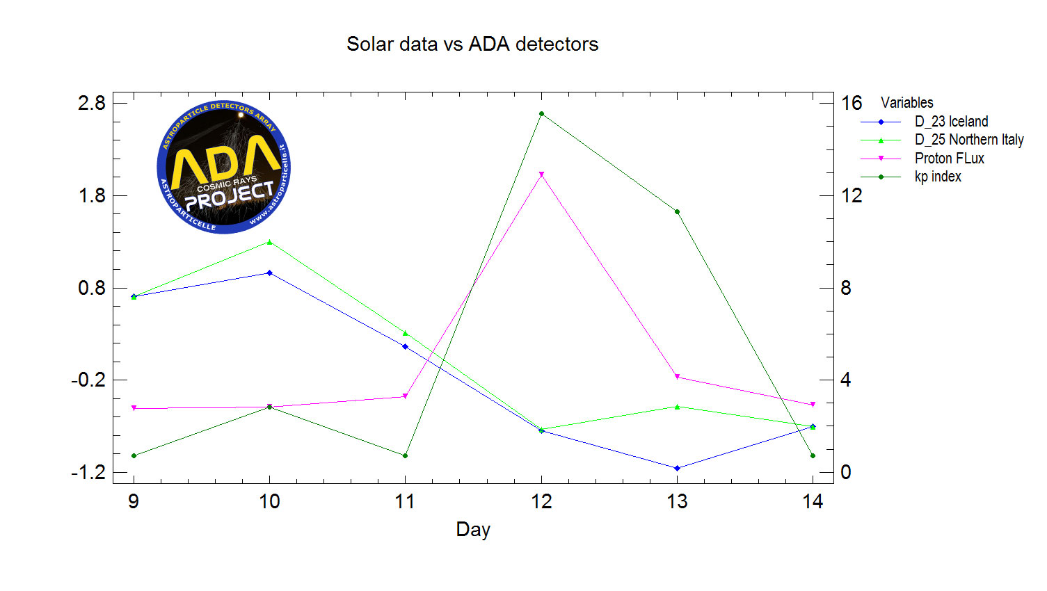 Le tempeste solari possono avere effetti devastanti per i satelliti in orbita alla Terra e anche alle linee di distribuzione elettriche. Mentre i raggi cosmici solari prodotti dai brillamenti possono avere effetto anche sulle forme viventi del nostro pianeta. Dal punto di vista dei raggi cosmici galattici, i CME provocano quasi sempre una diminuzione del flusso misurato al suolo, per via della barriera magnetica che il plasma solare trasporta con se, ciò è conosciuto come effetto Forbush (Dal fisico americano Scott Forbush). Nella rete di ADA e in tutti i rivelatori di raggi cosmici sulla superficie terrestre, a volte questa diminuzione può essere più o meno evidente, con picchi fino al 20% di diminuzione. Durante questo evento, nella maggior parte dei nostri rivelatori si è potuta notare una sensibile diminuzione del flusso.
