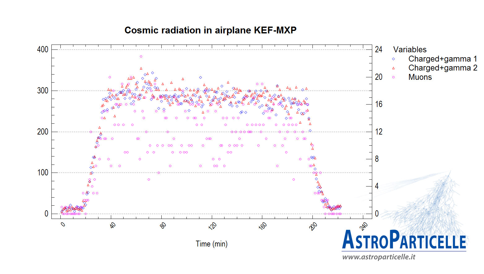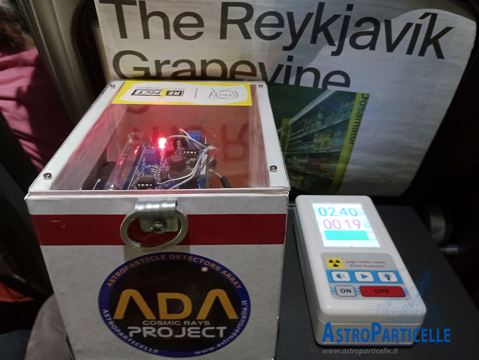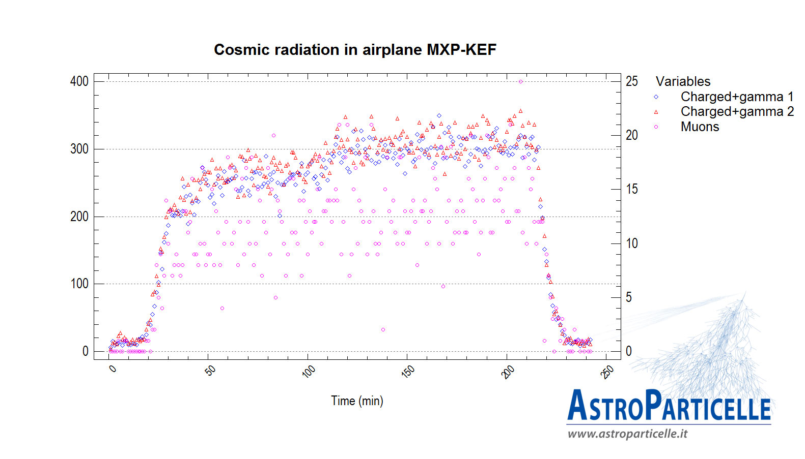 Recentemente abbiamo monitorato un volo tra Malpensa e Reykjavik, raccogliendo dati su tre tipi principali di radiazione: due canali di radiazione gamma e particelle cariche, chiamati Radiation-1 e Radiation-2, e un terzo dedicato esclusivamente ai muoni. L’analisi è stata condotta separando le fasi di andata e ritorno e applicando una regressione lineare ai dati, così da evidenziare le tendenze principali durante il volo. Il rivelatore utilizzato è l'affidabile AMD5ALI.